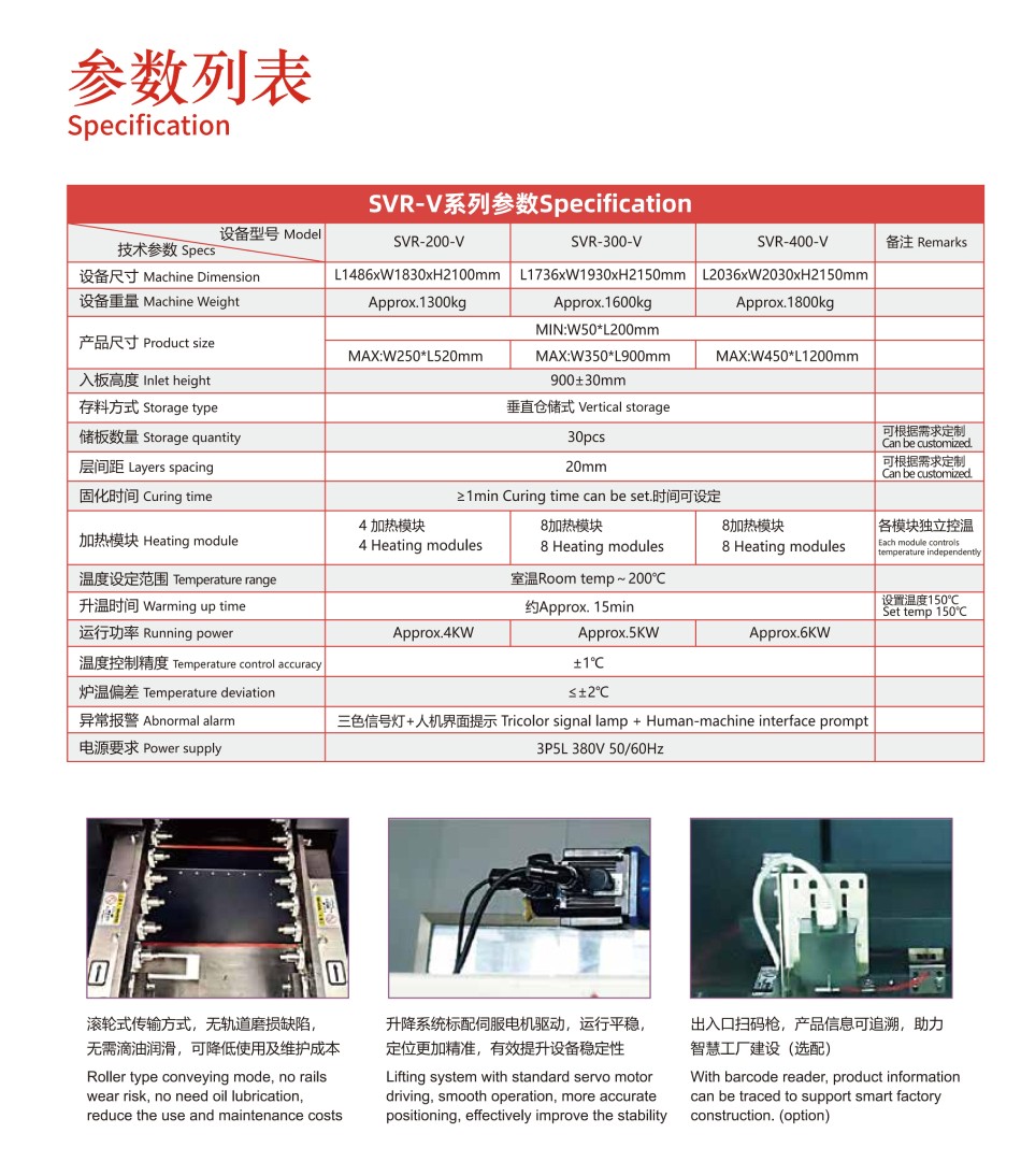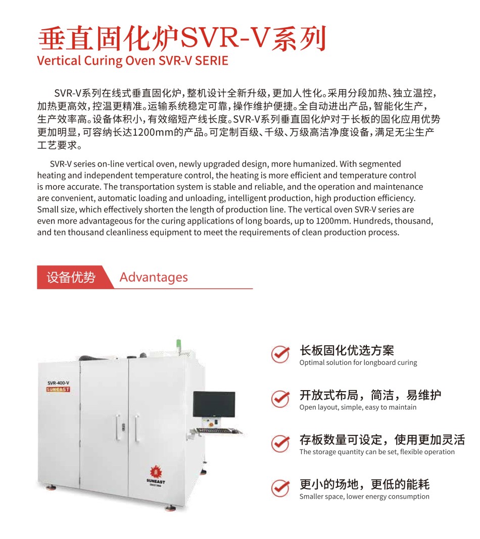SVR-V系列在線式垂直固化爐,整機(jī)設(shè)計(jì)全新升級(jí),更加人性化。采用分段加熱、獨(dú)立溫控,加熱更高效,控溫更精準(zhǔn)。運(yùn)輸系統(tǒng)穩(wěn)定可靠,操作維護(hù)便捷。全自動(dòng)進(jìn)出產(chǎn)品,智能化生產(chǎn),生產(chǎn)效率高。設(shè)備體積小,有效縮短產(chǎn)線長(zhǎng)度。SVR-V系列垂直固化爐對(duì)于長(zhǎng)板的固化應(yīng)用優(yōu)勢(shì)更加明顯,可容納長(zhǎng)達(dá)1200mm的產(chǎn)品??啥ㄖ瓢偌?jí)、千級(jí)、萬(wàn)級(jí)高潔凈度設(shè)備,滿(mǎn)足無(wú)塵生產(chǎn)工藝要求。