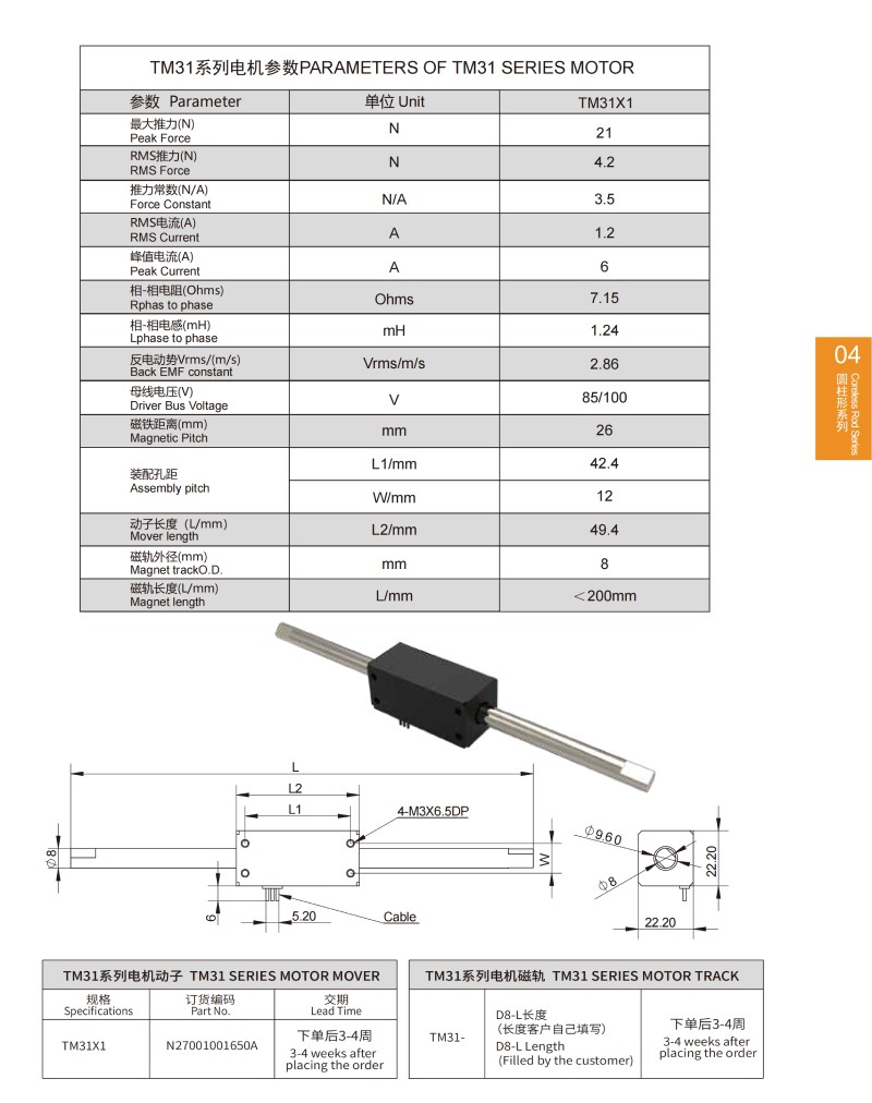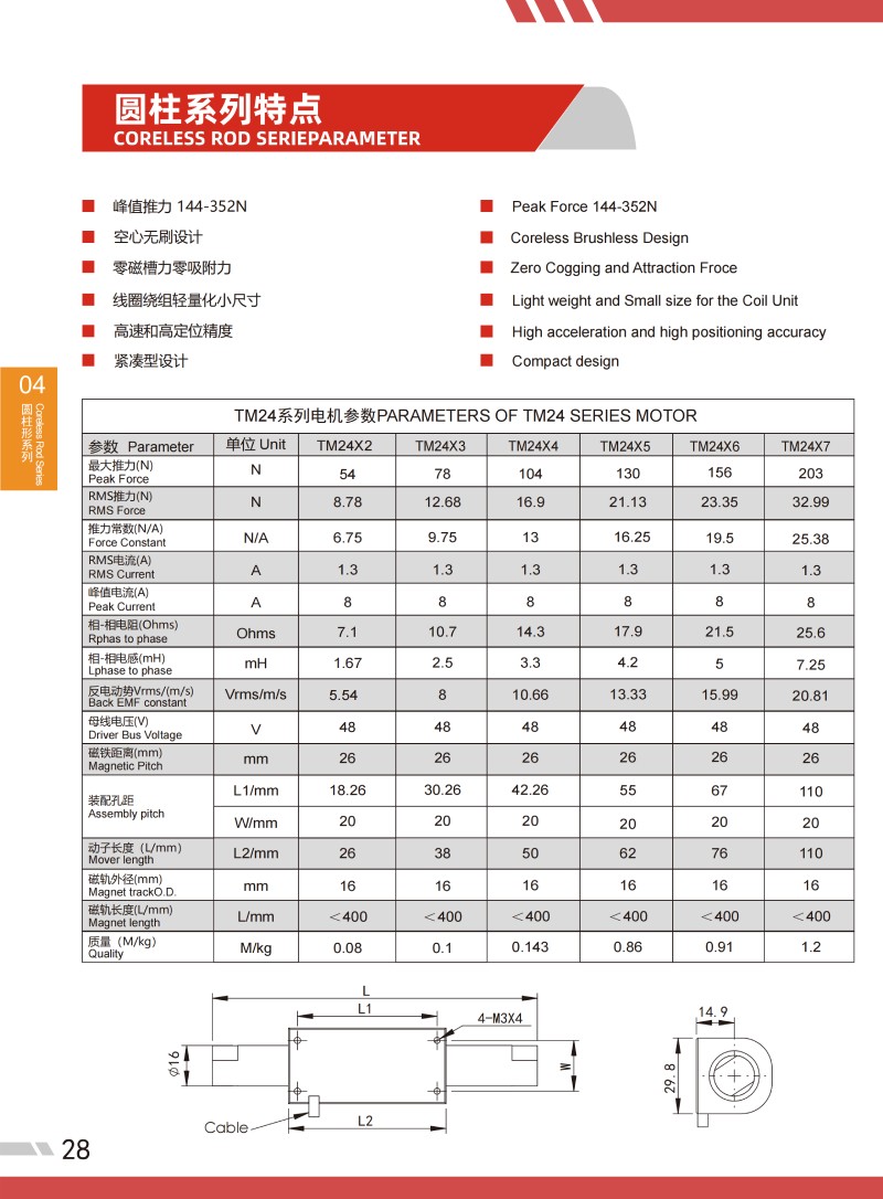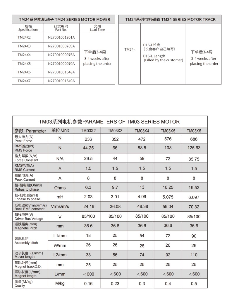 | TM 24系列圓柱形直線電機(jī)參數(shù)PARAMETERS OF TM 24 SERIES MOTOR | |||||||