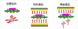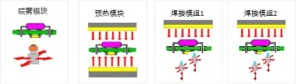 預(yù)熱模塊由底部預(yù)熱、頂部預(yù)熱、焊接保溫模塊組成。各溫區(qū)獨(dú)立循環(huán)、獨(dú)立控溫。可根據(jù)產(chǎn)品尺寸,自動關(guān)閉產(chǎn)品尺寸范圍外的加熱,節(jié)能簡單。