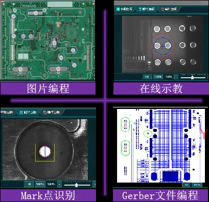 支持CAD、Gerber、坐標(biāo)文檔、圖片文檔多種方式進(jìn)行編程,標(biāo)配示教相機(jī),可在線視覺編程。支持離線編程。每個焊點(diǎn)參數(shù)都可獨(dú)立設(shè)置。全程可視化操作,在線調(diào)試方便快捷。自動優(yōu)化焊接順序,節(jié)省焊接時間。可提供MES系統(tǒng)接口。