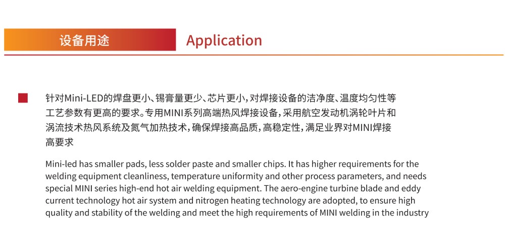 針對Mini-LED的焊盤更小、錫膏量更少、芯片更小,對焊接設(shè)備的潔凈度、溫度均勻性等工藝參數(shù)有更高的要求。專用MINI系列高端熱風(fēng)焊接設(shè)備,采用航空發(fā)動機渦輪葉片和渦流技術(shù)熱風(fēng)系統(tǒng)及氮氣加熱技術(shù),確保焊接高品質(zhì),高穩(wěn)定性,滿足業(yè)界對MINI焊接的高要求。